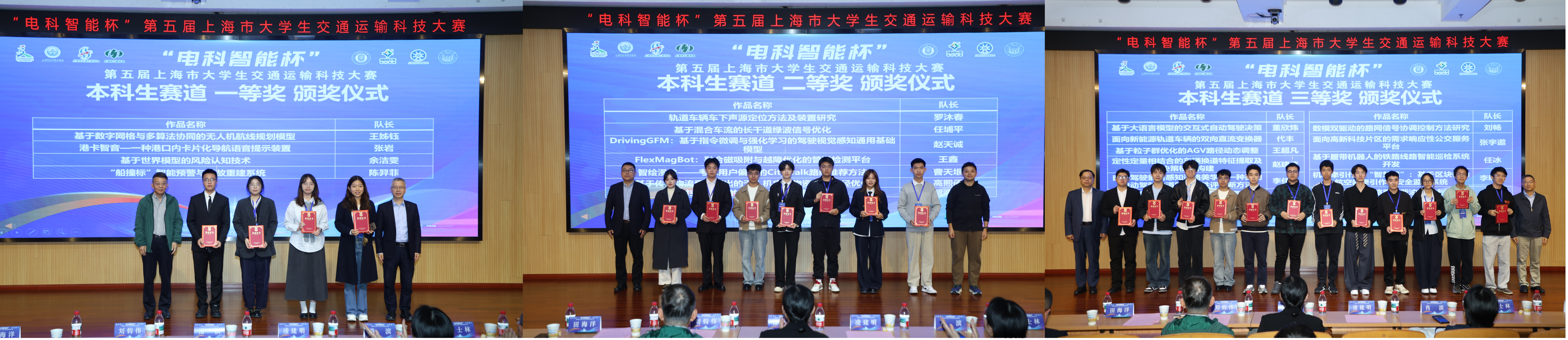 决赛分为本科生赛道和研究生赛道,经过激烈的现场答辩,依据评审专家组的综合打分,最终角逐出一等奖7支队伍,二等奖12支队伍,三等奖18支队伍,获奖名单见附件。在颁奖仪式上,赵来军、王士林为三等奖团队颁奖,田海洋、沈峰为二等奖团队颁奖,凌建明、刘钧伟为一等奖团队颁奖,潘祺为优秀组织单位同济大学、上海理工大学、上海海事大学颁奖。