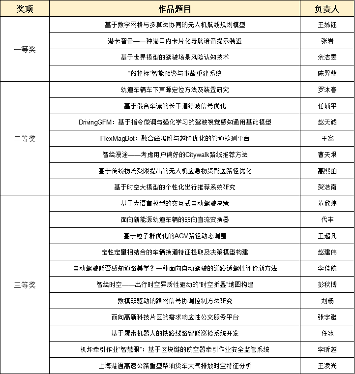 刘钧伟代表上海市公路学会向所有参赛团队致以敬意。同学们凭借扎实的专业知识、大胆的创新思维和务实的方案,呈现了一场交通科技盛宴。学会始终以培育青年人才、赋能行业革新为己任,比赛中,行业前沿探讨已被同学们转化为兼具创新性与实用性的解决方案,展现了将创新思维与行业需求深度融合的新质生产力。大赛虽已落幕,但对交通科技的探索永无止境,希望同学们永葆热爱,将赛场收获化为前行动力,在交通强国征程中勇攀高峰、书写青春华章。