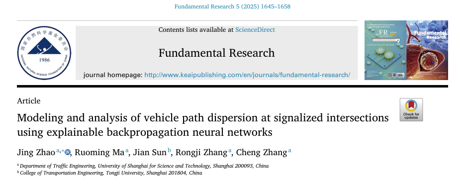 Jing Zhao, Ruoming Ma, Jian Sun, et al.,Modeling and analysis of vehicle path dispersion at signalized intersections using explainable backpropagation neural networks. Fundamental Research. 5(4) (2025) 1645-1658.